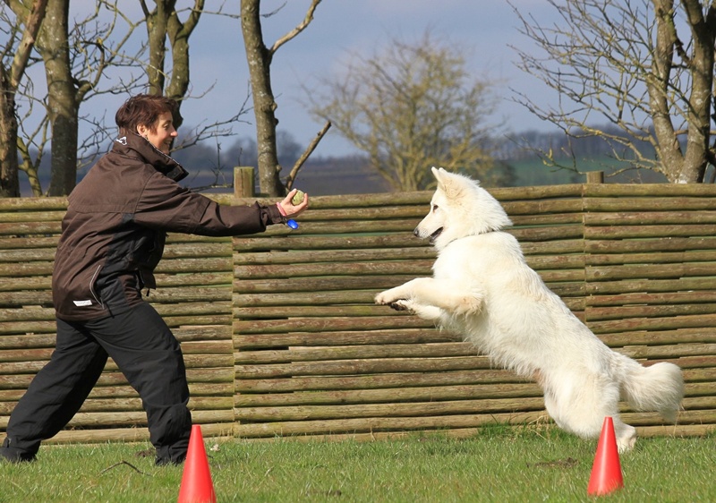 Auch im Winter wird fleißig mit den Hunden gearbeitet: Erika mit ihrem Keico (links) und Ebony beim Spielen mit Frauchen Jasmin