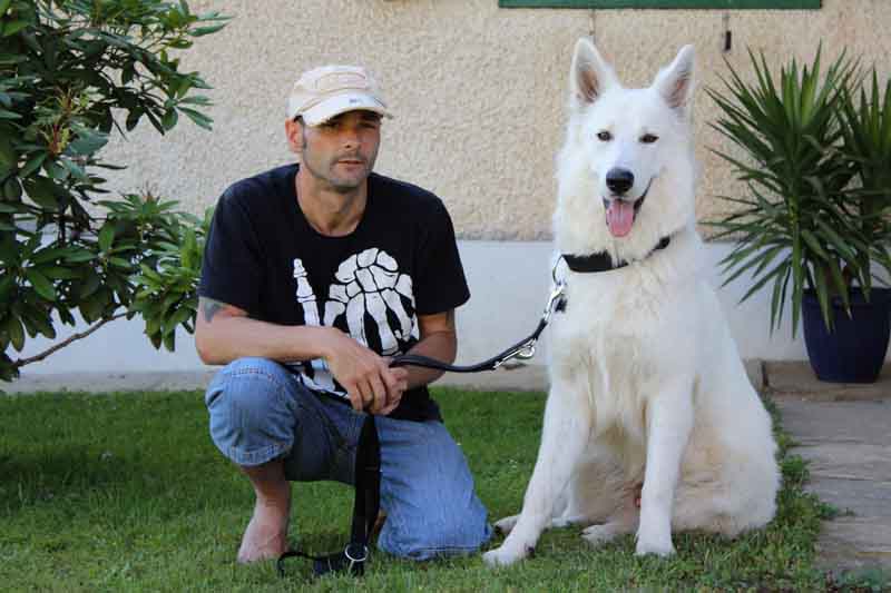 Links: Jack Daniels und Brigitte sind einfach ein wunderbares Team. Rechts: Aragon mit seinem großen Sohn Jack beim Besuch in der Hundeschule