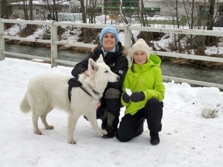 Links: Maya und Maruk beim Beutespiel. Rechts: Schwester Merci Bianca mit Alexandra und Lena im tief verschneiten Kärnten