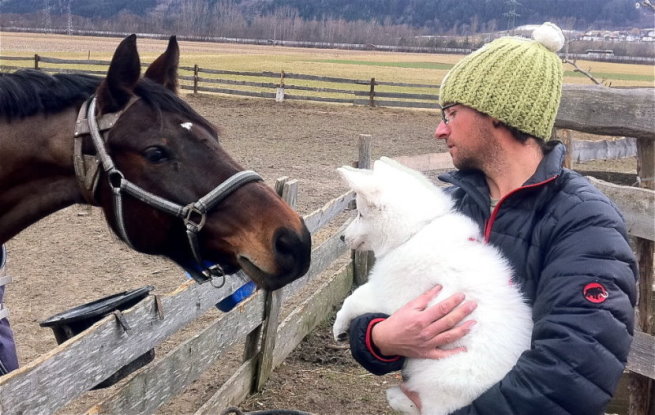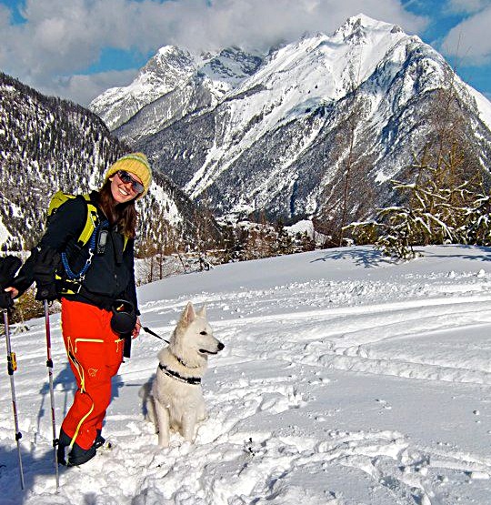 Endlich Schnee, wohin das Auge reicht. Was hier wie eine Akrobatik-Rock-Einlage aussieht - Lennox und Maya